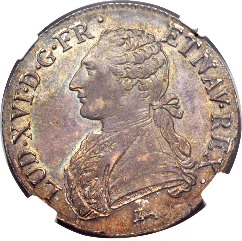 This specimen was lot 32095 in Heritage sale 3040 (Chicago, April 2015), where it sold for $387.75. The catalog description[1] noted, "Louis XVI Ecu 1787-R MS61 NGC, Dav. 1333, KM 564.14. Scarcer provincial Orleans, (R), mint. Some adjustment marks on reverse, yet with admirable slate gray toning and sharply struck. Few available in mint state."