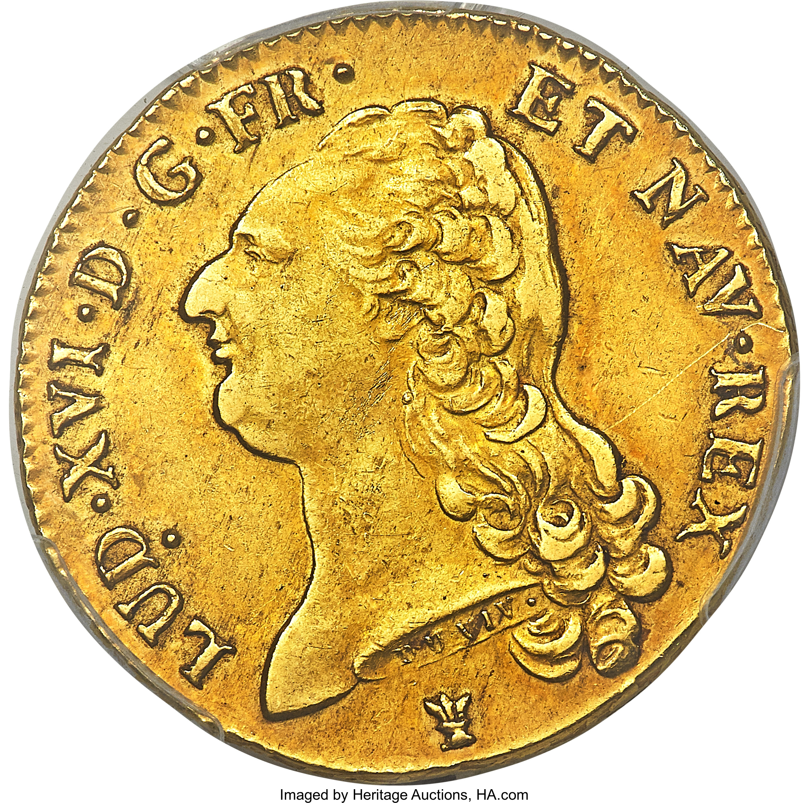 This specimen was lot 30778 in Heritage sale 3064 (Chicago, April 2018), where it sold for $1,020. The catalog description[1] noted, "Louis XVI gold 2 Louis d'or 1787-I AU Details (Scratch) PCGS, Limoges mint, KM 592.7, Gad-363 (R3). Lightly circulated with attractive reddish tone over the surfaces. A thin scratch behind Louis XVI's bust determines the 'details' grade."