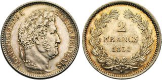 "FRANCE, Louis-Philippe (1830-1848), AR 2 francs, 1834 A, Paris. Gad-520. Petites griffes. Belle patine. Superbe à Fleur de Coin. (France, Louis-Philippe (1830-48), silver two francs of 1834, Paris mint. Fine scratches, nice toning, extremely fine to uncirculated.)"