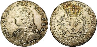 "FRANCE, Royaume, Louis XV (1715-1774), AR écu aux rameaux d'olivier, 1726 I, Limoges. Droit: B. habillé à gauche, décoré de la croix du Saint-Esprit. Revers: Ecu de France couronné, entre deux rameaux d'olivier. Dupl., 1675; Gad-321. 29,25 g. Petit éclat du flan sur la tranche et légères traces d"ajustage. Superbe. (kingdom of France, Louis XV (1715-74), silver écu of the olive branches of 1726, Limoges mint. Obverse: uniformed bust to left, decorated with the cross of the Holy Spirit; reverse: crowned arms of France between two olive branches. Small rim bump, slight adjustment marks, extremely fine.)"