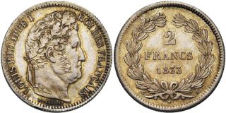 "FRANCE, Louis-Philippe (1830-1848), AR 2 francs, 1833A, Paris. Gad-520. Légers coups sur la tranche. Belle patine. presque Fleur de Coin. (kingdom of France, Louis Philippe, 1830-48, silver two francs of 1833, Paris mint. Minor rim nicks, nice patina, about Uncirculated.)"