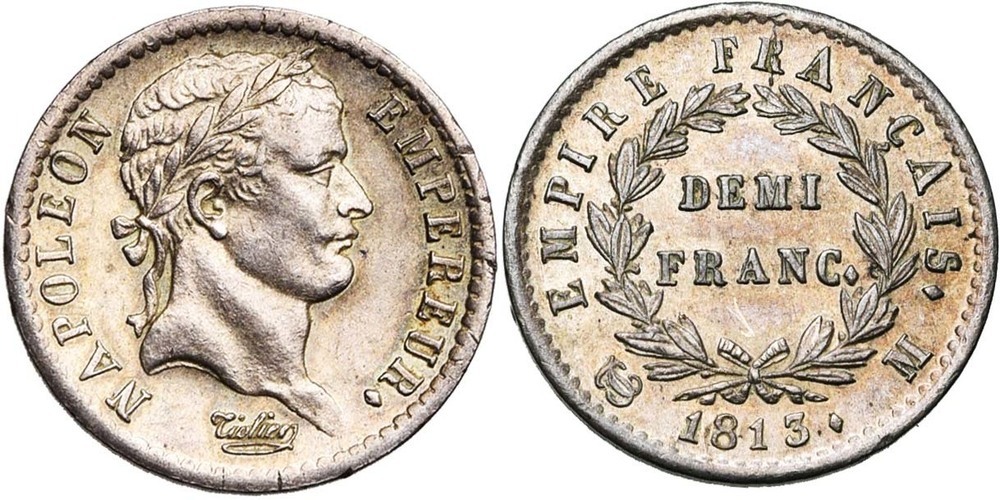 - 1813-M ½ franc: F.178/58, m. 158,503, a scarce date but not rare. SUP 350 vs 150 for 1813-A.