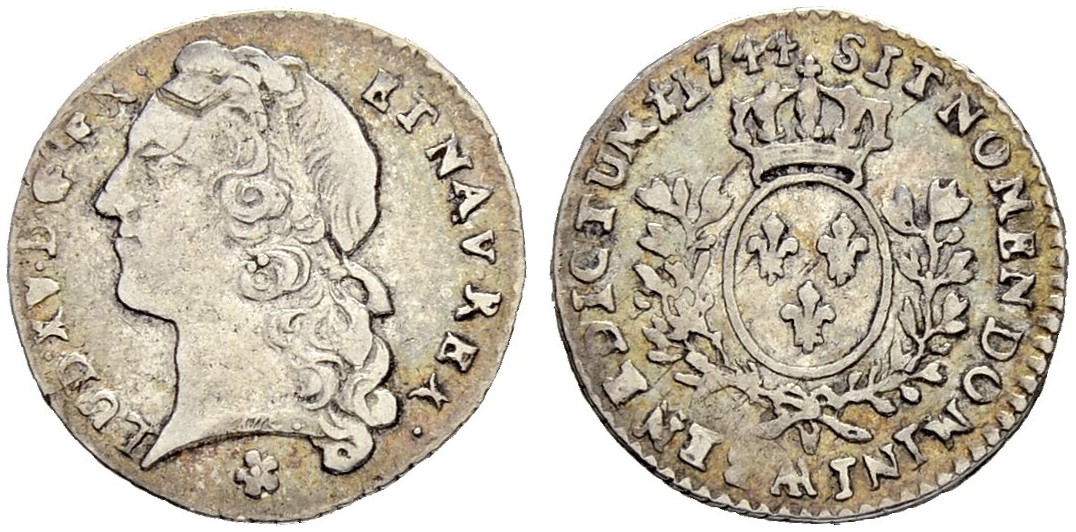 "FRANKREICH, Konigreich, Louis XV. 1715-1774. 1/20 Ecu au bandeau 1744 AA, Metz. 1.51 g. Gadoury 284. Selten. Gutes sehr schön. (kingdom of France, Louis XV, 1715-74, twentieth écu of the hair ribbon of 1744, Metz mint. Rare, Good very fine.)"