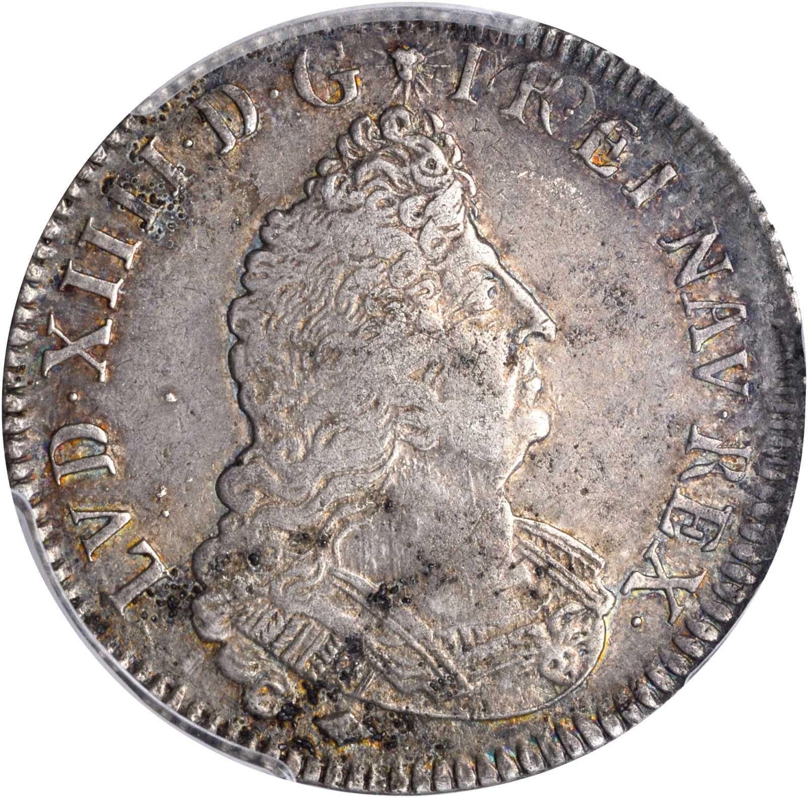 This specimen was lot 22507 in Stack's Bowers 2018 NYINC sale (New York, January 2018), where it sold for $156. The catalog description[1] noted, "FRANCE. 1/2 Ecu, 1702-BB. Strasbourg Mint. Louis XIV (1643-1715). PCGS Genuine--Environmental Damage, VF Details Secure Holder. KM-325.3; Gad-189a. Toned. From the Brighton Collection."