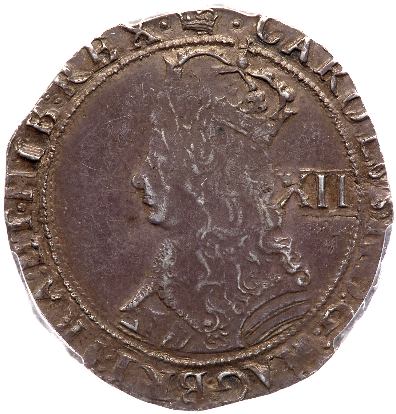 This specimen was lot 2060 in Goldberg sale 106 (Los Angeles, September 2018), where it sold for $780. The catalog description[1] noted, "Great Britain. Shilling, ND. S.3322. Charles II, 1660-1685. Third hammered issue (1660-62). Crowned bust left within inner circle with mark of value. Reverse; Shield with arms. Toned. PCGS graded EF-45."