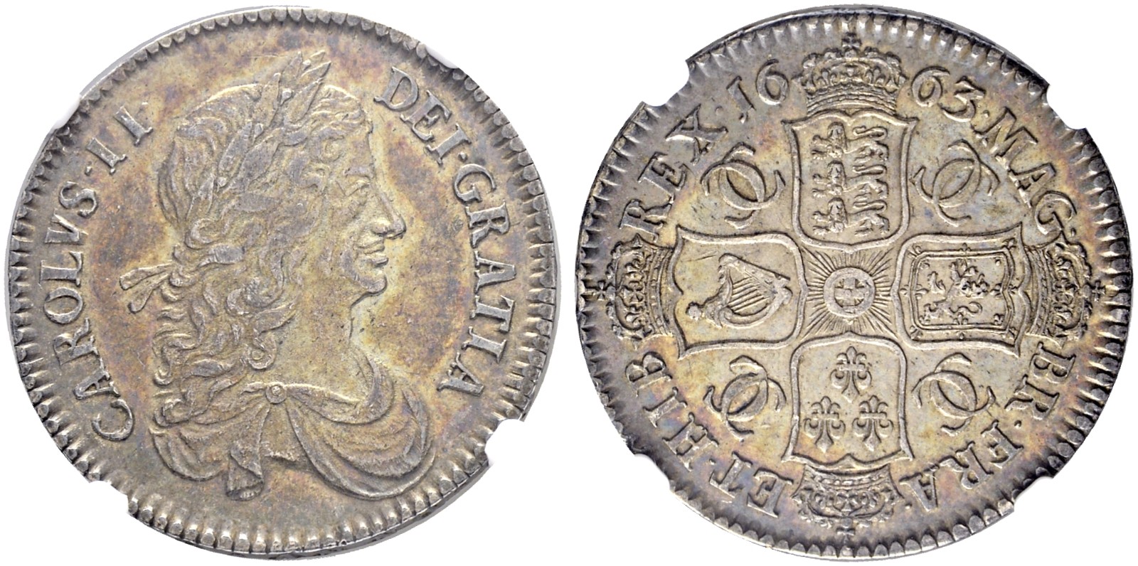 "GREAT BRITAIN | Königreich, Charles II. 1660-1685. 1/2 Crown 1663, London. Regierungsjahr XV. Seaby 3361. Selten in dieser Erhaltung. (kingdom of Great Britain, Charles II, 1660-85, half crown of 1663, London mint, regnal year XV. Rare in this condition. NGC AU58.)"