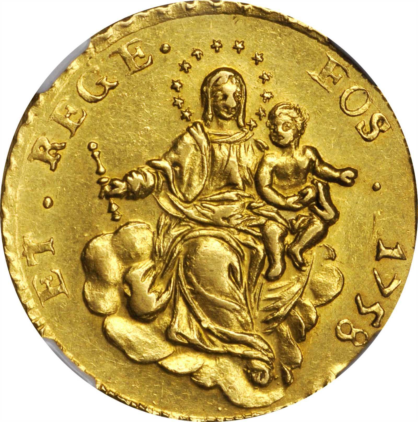 This specimen was lot 21236 in Stack's Bowers ANA sale (Philadelphia, August 2018), where it did not sell. The catalog description[1] noted, "ITALY. Genoa. Biennial Doges, 1528-1797. 50 Lire, 1758. NGC AU-53. Fr-441; KM-227; MIR-271/1. Griffins support crowned City Arms, "DUX. ET. GUB. REIP. GENU."; Reverse: Madonna and Child in clouds, "ET. REGE. EOS.", (And [a Little Child] shall rule them). The first year of this notably elusive issue, displaying splendid gold surfaces that possess charming color and minimal handling for the grade. RARELY offered as a date, the last sold example (seemingly in low UNC quality) appearing in a May 2016 Sincona auction where it brought 36,000 CHF hammer (approximately $36,000 at the time)."