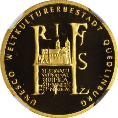 This specimen was lot 22494 in Stack's Bowers ANA sale (Philadelphia, August 2018), where it sold for $660. The catalog description[1] noted, "GERMANY. 100 Euro, 2003-J. UNESCO World Heritage Site Series. NGC PROOF-69 ULTRA CAMEO. Fr-3881; KM-228. Struck to commemorate Quedlinburg as an UNESCO World Heritage Site. Pristine to the unaided eye and desirable as a type not only for its recognition of the town that is situated just north of the Harz mountains, but also for its unique depiction of the German eagle."
