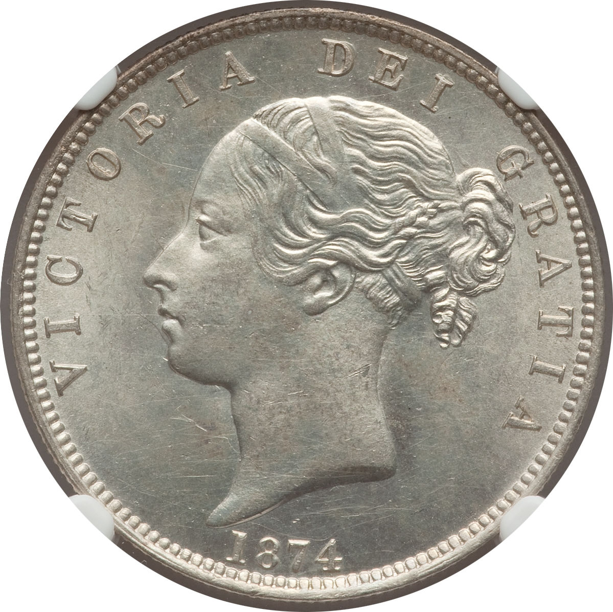 This specimen was lot 33444 in Heritage sale 3042 (Long Beach, September 2015), where it sold for $564. The catalog description[1] noted, "Victoria 1/2 Crown 1874 MS63 NGC, KM756, S-3889. A blast white example with minimal hairlines. A more than adequate example of the type. From The Bob Bennett Collection."
