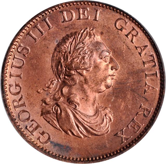This specimen was lot 10417 in Ponterio sale 169 (Baltimore, November 2012), where it sold for $230. The catalog description[1] noted, "GREAT BRITAIN. Half Penny, 1799. PCGS MS-64 RD. S-3778; KM-647. From the Cardinal Collection Educational Foundation."