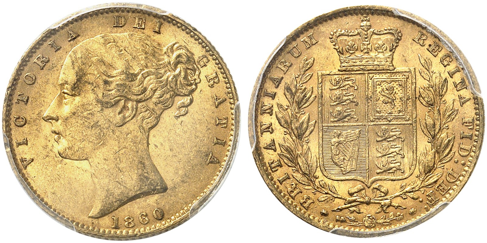 "Victoria, 1837-1901. Sovereign 1860, London. Young head. Seaby 3852 D. Fr-387 e. PCGS MS62. Überdurchschnittliche Erhaltung. (kingdom of Great Britain, Victoria, 1837-1901, sovereign of 1860, London mint, young head. Extraordinary condition, uncirculated.)"