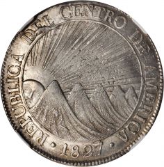 This specimen was lot 1125 in Stacks-Bowers NYINC sale (New York, January 2015), where it sold for $1,645. The catalog description[1] noted, "GUATEMALA. 8 Reales, 1827-M. NGC MS-61. KM-4. Lightly toned and attractive."