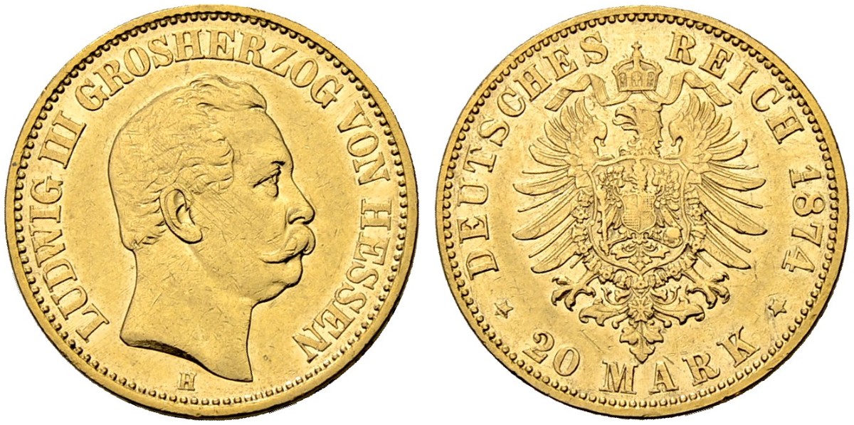 "Hessen, Grossherzogtum, Ludwig III. 1848-1877. 20 Mark 1874 H, Darmstadt. 7.94 g. J. 217. Fr-3784. Gutes sehr schön. (grand duchy of Hesse, Louis III, 1848-77, twenty mark of 1874, Darmstadt mint. Good very fine.)"