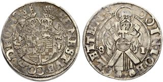 "Hohnstein, Grafschaft, Ernst VII. 1580-1593. 1/4 Taler 1581, Ellrich. Ausbeute der Grube St. Andreas. Münzmeister Alex Sickl. 7.20 g. Schulten 173 a. Müseler 31/85. Slg. Vogelsang -. Von grösster Seltenheit. Sehr schön. (Germany, county of Hohnstein, Ernest VII, 1580-93, quarter thaler of 1581, Ellrich mint, for the St. Andrew mine. Of the highest rarity, Very fine.)"