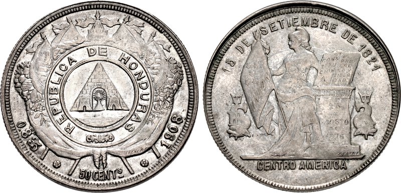 This specimen was lot 1864 in Classical Numismatic Group's auction of the Robert Lissner collection (Chicago, August 2014), where it sold for $605. The catalog description[1] noted, "HONDURAS, Republic. 1840-pres. AR 50 Centavos. Tegucicalpa mint. Dated 1908/1897. In NGC encapsulation graded MS 62. Silver, gray, and light blue patina with untoned reverse. Highest graded specimen and only Mint State example. Extremely rare type and overdate. Ex Whittier Collection (Heritage 410, 2 June 2006), lot 17267."