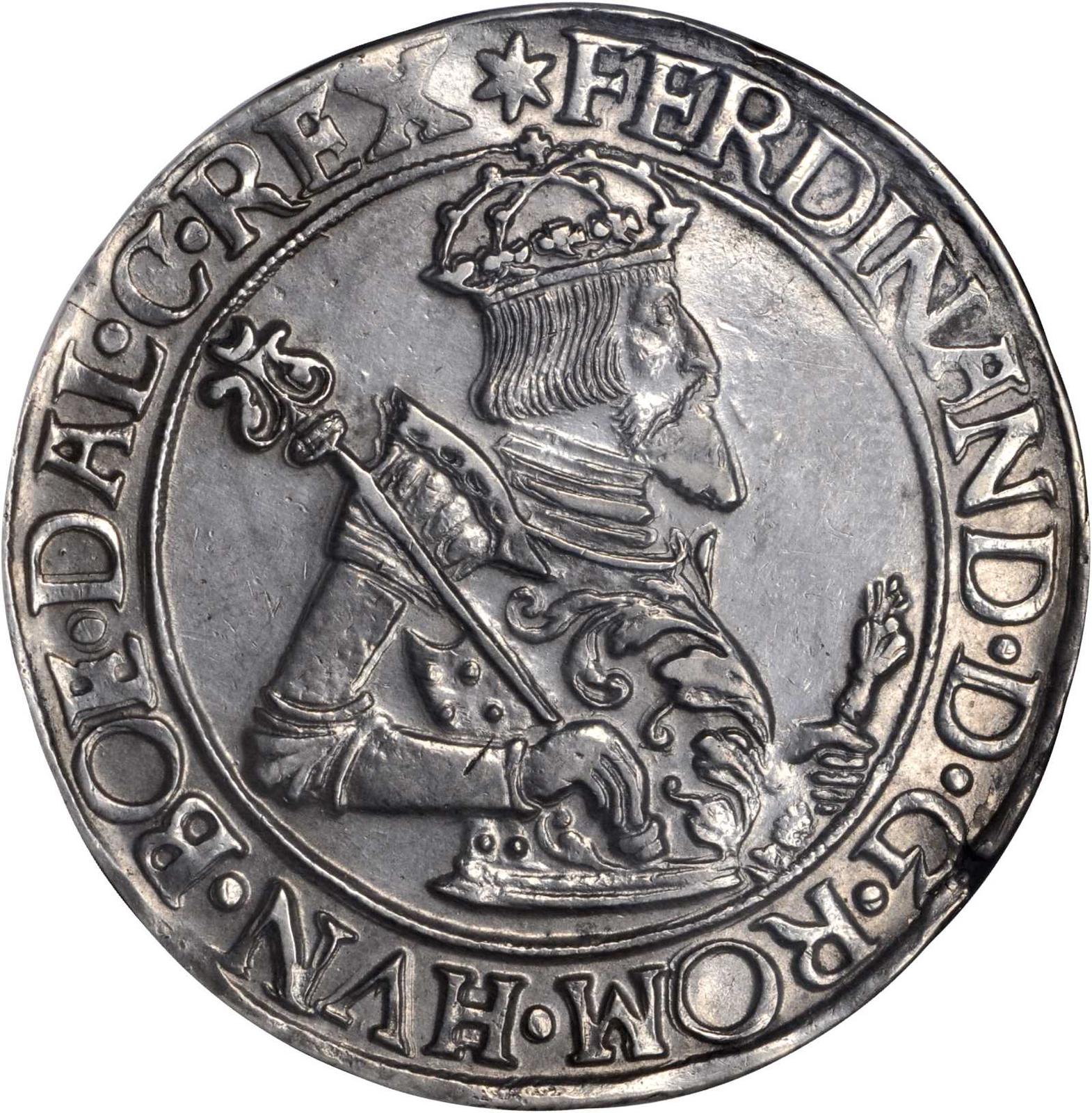 This specimen was lot 6710 in Stack's Bowers NYINC sale (New York, January 2017), where it sold for $1,527.50. The catalog description[1] noted, "HUNGARY. Taler, 1555-KB. Kremnitz Mint. Ferdinand I (1526-64). NGC AU Details--Removed from Jewelry. Dav-8032; Huszar-913. Good full strike with no muddling or doubling and leaving bold legends and clear detail to finely rendered bust and eagle. As noted there is some small evidence of former mounting but overall far more original surfaces than are normally encountered with former jewelry pieces. Light even wear consistent with the grade tier and no significant contact marks. Light gray tone returning and quite appealing. From the Mezo-Toth Kalman Collection."
