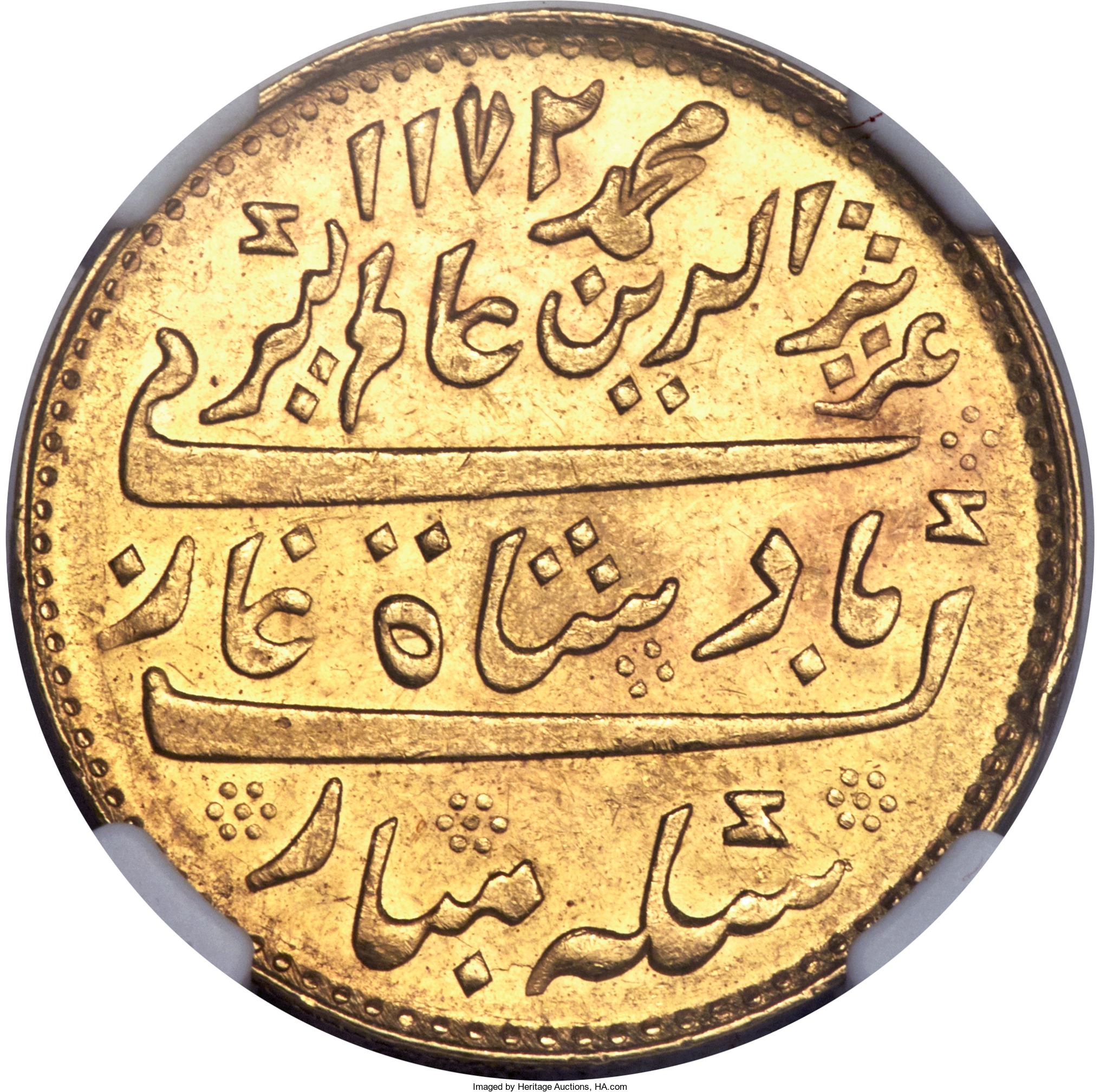 This specimen was lot 31064 in Heritage sale 3049 (Long Beach, September 2016), where it did not sell. The catalog description[1] noted, "British India. Madras Presidency gold Mohur AH 1172//6 (1817) MS63 NGC, Arkat mint, Fr-1584, Pr-238. Expressing a light layer of rose color atop the golden surfaces, surrounded by towering rims that halo the script motifs. Other than a few, minor handling occurrences, this conditionally-superb example absolutely satisfies. Ex. Lawrence Adams Collection."