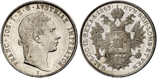 "KAISERREICH ÖSTERREICH, Franz Josef I. 1848-1916. 1/2 Scudo 1853, V, Venedig. J. 308. R Vorzüglich. (Empire of Austria, Francis Joseph I, 1848-1916, half scudo of 1853, Venice mint. Scarce, extremely fine.)"