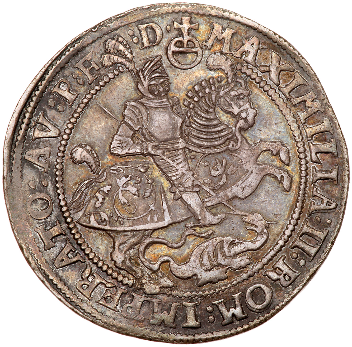This specimen was lot 3741 in Goldberg sale 85 (Los Angeles, June 2015), where it sold for $529. The catalog description[1] noted, "German States: Mansfeld-Eisleben. Taler, 1577/6. Dav-9494. Johann-Georg I, Peter-Ernst I, Johann-Hoyer III, 1573-1579. Arms. Reverse: St. Geroge. Toned. NGC graded EF-45. Ex: Purchased by private treaty in 1981."