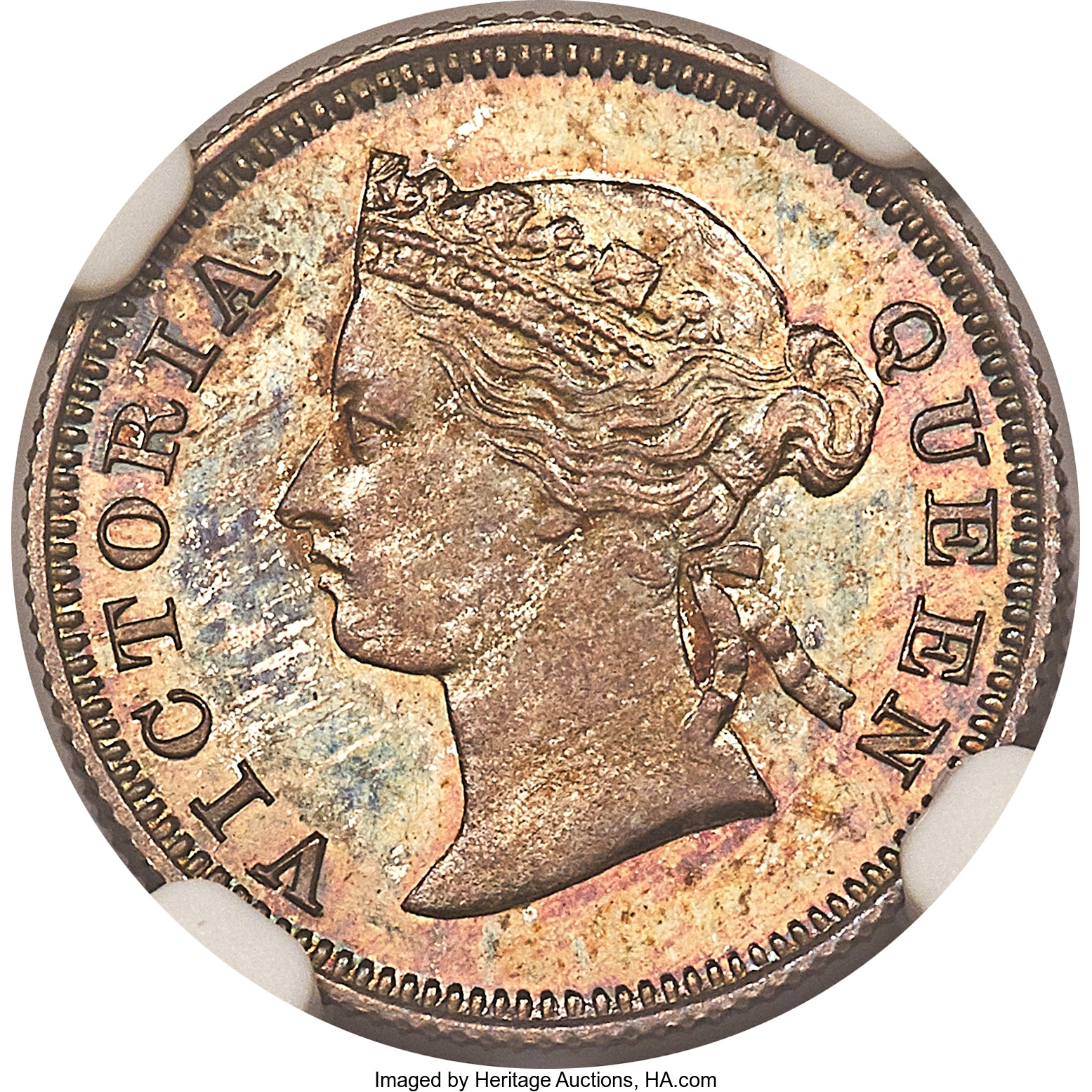 This specimen was lot 31250 in Heritage sale 3064 (Chicago, April 2018), where it sold for $1,800. The catalog description[1] noted, "British Colony. Victoria Proof 10 Cents 1878 PR66 NGC, London mint, KM 10.1. A gorgeous premium Gem example of this rare Proof that exhibits reflective surfaces that appear virtually flawless and rich multicolored patina over both sides with heavy saturations of blue, purple, green and red color. Tied with one other example for the finest example certified by either NGC or PCGS. From the Jamestown Collection."