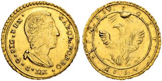 KM 140, Fr-887, struck 1734-35, 4.40 g, .906 fine gold. listed under Sicily.