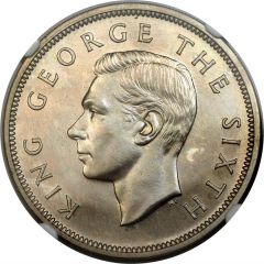 This specimen was lot 30403 in Heritage sale 3037 (New York, January 2015), where it sold for $3,290. The catalog description[1] noted, "George VI Proof 1/2 Crown 1951 PR66 NGC, KM19. Sublime, with exceptionally glossy surfaces that appear golden-gray upon first glance, but upon closer inspection actually yield a surprising array of pastel tone. The devices are most impressive, with all detail fully-rendered and delicately tinted by the surrounding complexion. Tremendously appealing and nearly perfect in all respects."