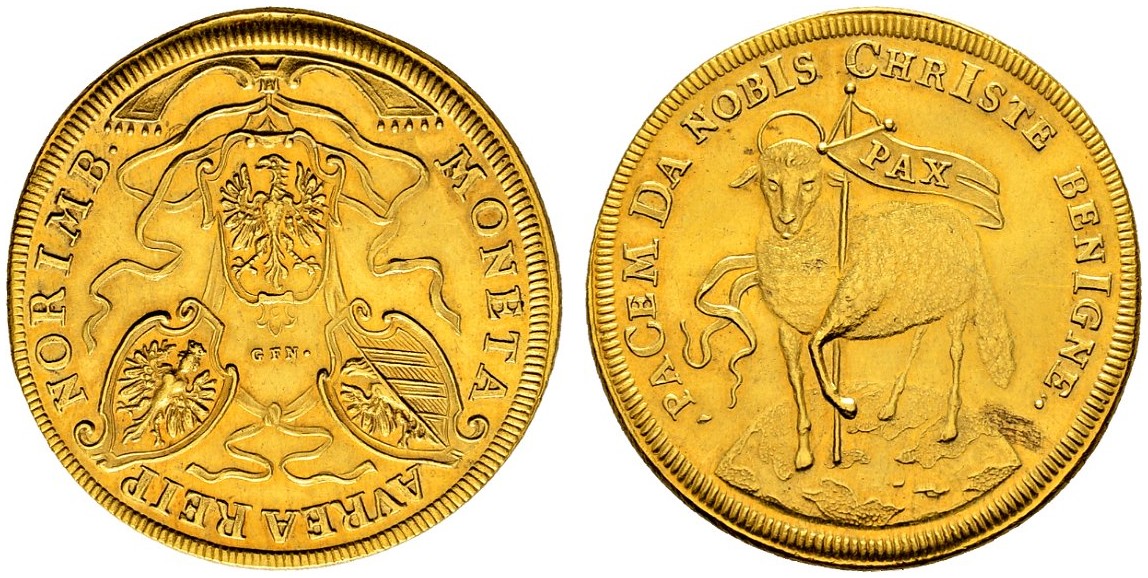 "Nurnberg, 4 Dukaten 1703. 13.91 g. Kellner 46 Anm. Fr-1379. Vorzüglich. Leicht gewellt (city of Nurnberg, quadruple ducat of 1703, extremely fine, slightly bent.)"
