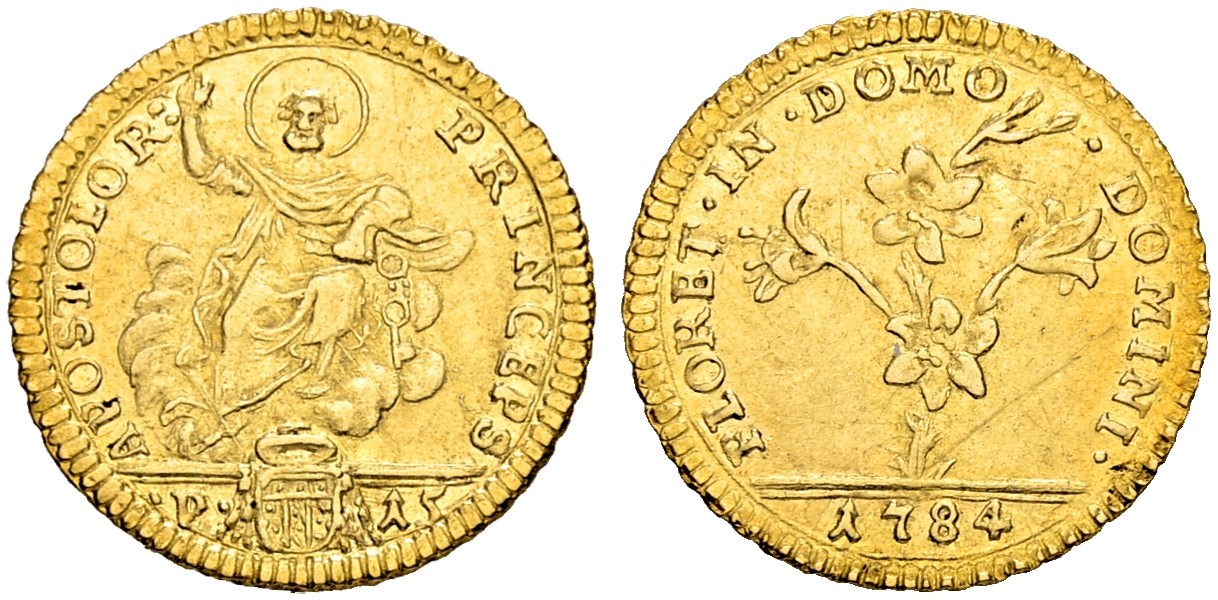 "Kirchenstaat, Pius VI. 1775-1799. 1/2 Doppia 1784, Roma. 2.70 g. Berman 2956. Fr-247. Sehr schön-vorzüglich. (Papal States, Pius VI, 1775-99, half doppia of 1784, Rome mint. Very fine-extremely fine.)"