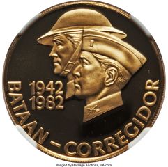 This specimen was lot 33609 in Heritage sale 3064 (Chicago, April 2018), where it sold for $1,146. The catalog description[1] noted, "Republic gold 1500 Piso 1982-FM PR69 Ultra Cameo NGC, Franklin mint, KM237. A bright, flashy piece struck to commemorate the 40th anniversary of the [battle of] Bataan-Corregidor. AGW 0.2830 oz."