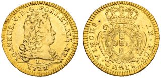 "PORTUGAL | Königreich, João V. 1706-1750. 1/2 Escudo 1722, Lissabon. 1.75 g. Gomes 41.01. Fr-91. Gutes sehr schön. Kleiner Randfehler. (kingdom of Portugal, John V, 1706-50, half escudo of 1722, Lisbon mint. Good very fine, Minor edge nick.)"