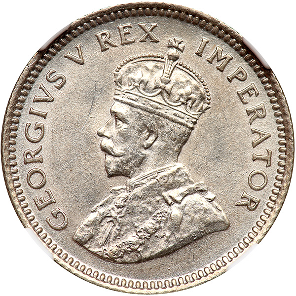 This specimen was lot 4612 in Goldberg sale 84 (Los Angeles, January 2015), where it sold for $529. The catalog description[1] noted, "South Africa. Sixpence, 1925. KM-16.1. George V. NGC graded MS-62."