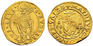 "Salzburg, Erzbistum, Matthäus Lang von Wellenberg, 1519-1540 Dukat 1522. Zöttl 157. BR -. Probszt -. Fr-600. Selten. Fast vorzüglich. Etwas gewellt. (archbishopric of Salzburg, Matthäus Lang von Wellenberg, 1519-1540, ducat of 1522. Scarce, choice extremely fine, bent.)"