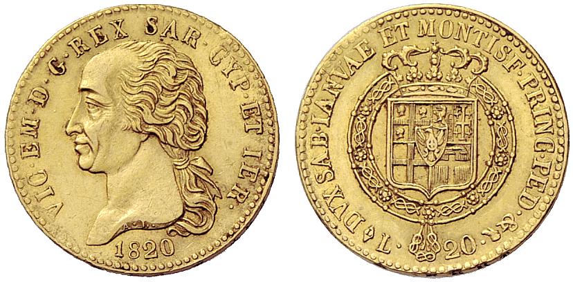 ITALIEN Savoia-Sardegna Vittorio Emanuele I. 1802-1821. 20 Lire 1820, Torino. 6,44 g. Fr. 1129. Pag. 8. Schl. 131. Fast vorzüglich.