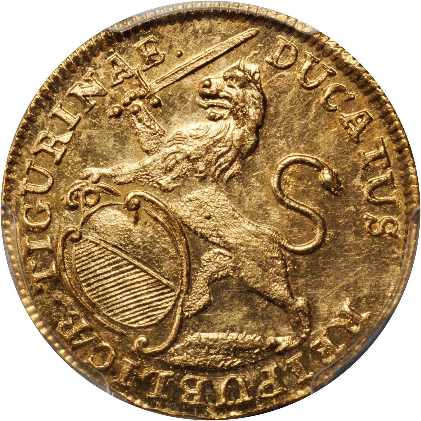 This specimen was lot 1641 in Stack's Bowers ANA auction (Chicago, August 2014), where it sold for $__. The catalog description[1] noted, "SWITZERLAND. Zurich. Ducat, 1767. PCGS MS-63 Secure Holder. Fr-486a; KM-140; HMZ-2-1161ii. Attractive with nice mint luster. From the Ervin F. Bickley Collection of Swiss Coins."