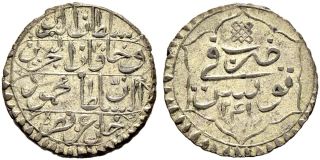 This specimen was lot 76 in Sincona sale 31 (Zurich, October 2016), where it sold for 275 CHF (about US$327 including buyer's fees). The catalog description[1] noted, "OTTOMAN TUNIS | Mahmud II (1223-1255ah/1808-1839ce) 4 kharub 1241ah (1825ce) Bi KM 88 RR -unc 2.86 g."
