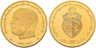 This specimen was lot 354 in Sincona sale 31 (Zurich, October 2016), where it sold for 1,100 CHF (about US$1,306 including buyer's fees). The catalog description[1] noted, "REPUBLIC OF TUNISIA, 10 dinars 1986ce/1406ah AU KF 124, KM 335 725 French legend Pf 18.78 g."