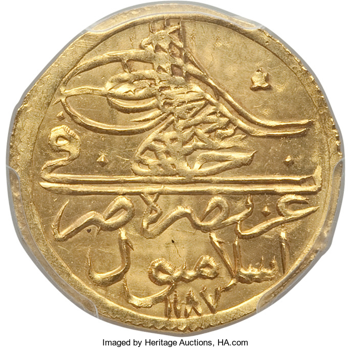 This specimen was lot 33916 in Heritage sale 3064 (Chicago, April 2018), where it sold for $504. The catalog description[1] noted, "Abdul Hamid I gold 1/2 Zeri Mahbub AH 1187 Year 10 (1784) MS65 PCGS, KM 410. An incredibly well-preserved gem with radiant golden luster. This is currently the only certified example at PCGS, and impressively so at this level."