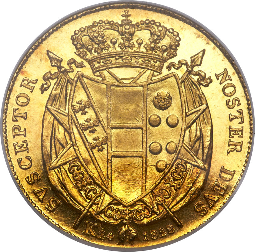 This specimen was lot 31209 in Heritage sale 3037 (New York, January 2015), where it sold for $18,800. The catalog description[1] noted, "Florence - Tuscany. Leopold II gold 80 Fiorini 1828 MS64 NGC, KM-C78, Fr-343. A rare type, and only the second example that we have ever offered. The first example, an NGC MS61, sold in September, 2013 for a hammer price of $5,500. The current piece is far superior to that one, both in technical grade and eye appeal, and we expect the final price to reflect that. Among the finest known of this type."