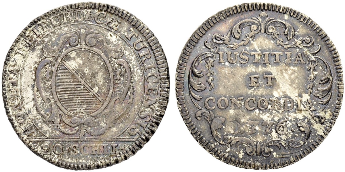 "SWITZERLAND, Stadt und Kanton Zürich, 20 Schilling (Halbgulden) 1776. 7.53 g. D.T. 447b. HMZ 2-1166jj. Fast FDC. Hübsche Patina. (canton of Zurich, twenty schilling (half gulden) of 1776. About uncirculated, Attractive patina.)"