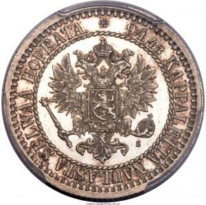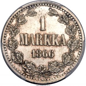 This specimen was lot 30704 in Heritage sale 3049 (Long Beach, September 2016), where it sold for $2,350. The catalog description[1] noted, "Russian Duchy Proof Markka 1866-S PR64 Deep Cameo PCGS, Helsinki mint. An undeniable stunner in hand, with full flash emanating from the mirrors and just a hint of autumnal color touching the design features. At present time, this is the only certified Proof example of the type by PCGS." This type was issued 1864-67 and 1870.