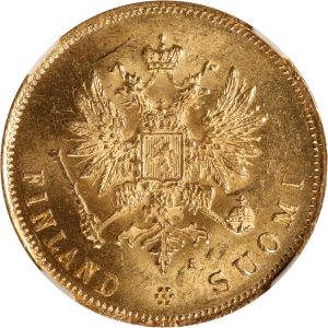 This specimen was lot 70667 in Stack's Bowers Collector's Choice sale (Costa Mesa, CA, June 2022), where it sold for $384. The catalog description[1] noted, "FINLAND. 10 Markkaa, 1881-S. Helsinki Mint. Alexander II or Alexander III of Russia. NGC MS-64. Offering near-Gem quality, this robust example dazzles with cartwheel brilliance and luster." This type is listed for 1879-82 and was struck to the standard of a French gold ten francs.