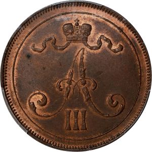 This specimen was lot 74321 in Stack's Bowers Collectors Choice sale (Costa Mesa, CA, September 2023), where it sold for $552. The catalog description[1] noted, "FINLAND. 10 Pennia, 1889. Helsinki Mint. Alexander III. PCGS MS-63 Brown. PCGS population: 1, none finer (for all color designations). Nearly 20% of the original mint orange color remains, and it is most vivid in the protected areas around the design elements. Otherwise toned in warm gray brown, both sides are lustrous with a satin to softly frosted texture. A single Light carbon spot is noted for accuracy near 10 o'clock on the obverse, but otherwise there is nary an imperfection to spot that would prevent near-Gem or Gem. Emanating from an exceedingly popular and difficult issue, there is sure to strong demand from specialists for this 'top pop.'" This type is listed for 1889-91 and is fairly scarce. Russian defeats in World War One enabled the Finns, who had long chafed under Russian rule, to declare independence.
