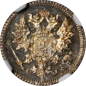 This specimen was lot 2359 in Stack's Bowers NYINC sale (New York, January 2017), where it sold for $1,292.50. The catalog description[1] noted, "FINLAND. 25 Pennia, 1890. NGC PROOF-67. Razor sharp with bold rims and devices. Incredibly brilliant hard mirror fields beam luster through the light golden orange toning which clings around the eagle and among its feathers. RARE and of such high grade it must surely be among the finest available. The only example graded by NGC or PCGS." This type is listed for 1872-76, 1889-99, 1907-17 and was struck for Finland by the czarist administration. Russian defeats in World War One enabled the Finns, who had long chafed under Russian rule, to declare independence.