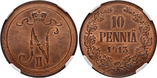 "RUSSLAND Kaiserreich und Föderation, Nicholas II. 1894-1917, 10 Penniä 1913, Helsinki Mint. Mintage for Finland. NGC MS64 RD. Rotkupfer, Red copper."