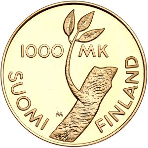 The Republic of Finland was established in 1917 after prior domination by Russia. The coinage of Finland was reformed in 1963, with 100 old markkaa = 1 new markka. This specimen was lot 1859 in Goldberg sale 93 (Los Angeles, September 2016), where it sold for $352.50. The catalog description[1] noted, "Finland. 1000 Markkaa, 1997 Choice Brilliant Proof. 80th Anniversary of Independence. With case and certificate. Choice Brilliant Proof."