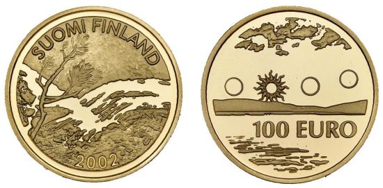 "FINLANDE, République (1917-), AV 100 euro, 2002. Paysage de Laponie. Encapsulé. Ecrin. Titre 0,900. (republic of Finland, since 1917, gold 100 euro of 2002, for the Lappland country. Encapsulated with box, Proof.)"