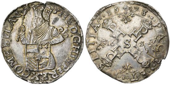 "VLAANDEREN, Graafschap, De Staten in opstand (1577-1584), AR halve Statendaalder, 1578, Brugge. Vz/ Gekroond bb. van Philips II v.v., met scepter en wapenschild voor zich houdend. Kz/ Kruis gevormd door de letters P-H onder kronen. Waarde in het veld. Barst in de muntplaat. Mooie patina. Prachtig. (county of Flanders, States Revolt, 1577-84, silver half States dollar of 1578, Bruges mint. Obverse: crowned half-length bust of Philip II holding a scepter and supporting a shield; reverse: cross formed of the letters "P-H" under crowns, an "S" in the center. Planchet crack, nice patina, Extremely Fine.)"