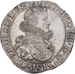 "VLAANDEREN, Graafschap, Philips IV (1621-1665), AR dukaton, 1633, Brugge. Eerste type. Vz/ Bb. r., met brede kraag. Kz/ Gekroond wapenschild gehouden door twee leeuwen. Onderaan het juweel van het Gulden Vlies. Minieme barstjes in de muntplaat. Scherp portret. Zeer zeldzaam in deze kwaliteit. (county of Flanders, Philip IV (1621-65). silver ducaton of 1634, Bruges mint, first type. Obverse: bust with ruffed collar; reverse: crowned arms supported by two lions, jewels of the Order of the Golden Fleece below. Minor planchet defects, sharp portrait, very rare in this quality, about Extremely Fine.)