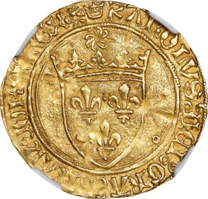 This specimen was lot 42169 in Stack's Bowers ANA sale (Chicago, August 2024), where it sold for $2,880. The catalog description[1] noted, "FRANCE. Ecu d'Or, ND (1483-98). Limoges Mint. Charles VIII. NGC MS-63. Secret mint pellet located under 10th letter of legends. Obverse: Crowned coat-of-arms; sunburst above; Reverse: Cross potent over cross fleuree, with polylobe at center. Quite well centered and struck, with a Choice level of preservation and some evidence of ghosting upon the obverse." This écu d'or au soleil was issued for Charles VIII from numerous mints. It is the second emission of July 1494. It should show a fleur-de-lys at the start of the legends but instead has a coronet. Most of the mints placed a quadrilobe at the center of the cross but Perpignan used a "P". The Bourges mint placed a "B" in the legend on both sides. Duplessy notes that the face value was 36 sols, 3 deniers tournois. In 1540, the use of letters as mintmarks was regularized and the "secret dots" were abandoned.