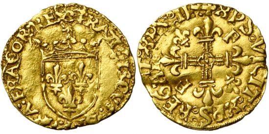 "FRANCE, Royaume, François Ier (1515-1547), AV demi-écu d'or au soleil, 3e émission (juillet 1519), point 5e, Toulouse. 5e type. D/ Ecu de France couronné. R/ Croix fleurdelisée cantonnée de deux lis et de deux F. Rare Double frappe. Très Beau. Provient du Crédit de la Bourse, Paris, octobre 1989. (kingdom of France, Francis I, 1515-47, gold half écu of the sunburst, third emission, July 1519, dot under the fifth letter, Toulouse mint, fifth type. Obverse: crowned arms of France; reverse: floriate cross cantonned with two lilies and two "F's". Rare, double struck, Very Fine.)"